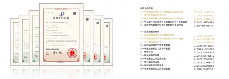 在研发端,与大连理工大学、浙江省医学科学院、云南大学、云南农业大学、西南林业大学朱有勇院士团队、龙陵县石斛研究所等高校及科研机构建立长期合作关系。截止目前,品斛堂已获得5项发明专利和11项实用新型专利,其中,自主研发的一种紫皮石斛原浆饮料制备方法及其产品,于2024年1月16日获国家发明专利。