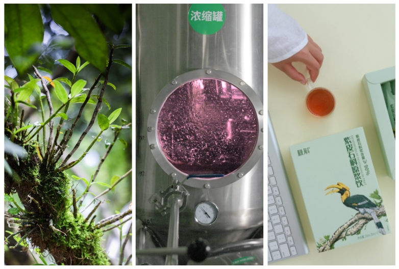 在种植端,从建立石斛种质资源库开始优选种源,到自有1000亩石斛示范种植基地保证原料品质。